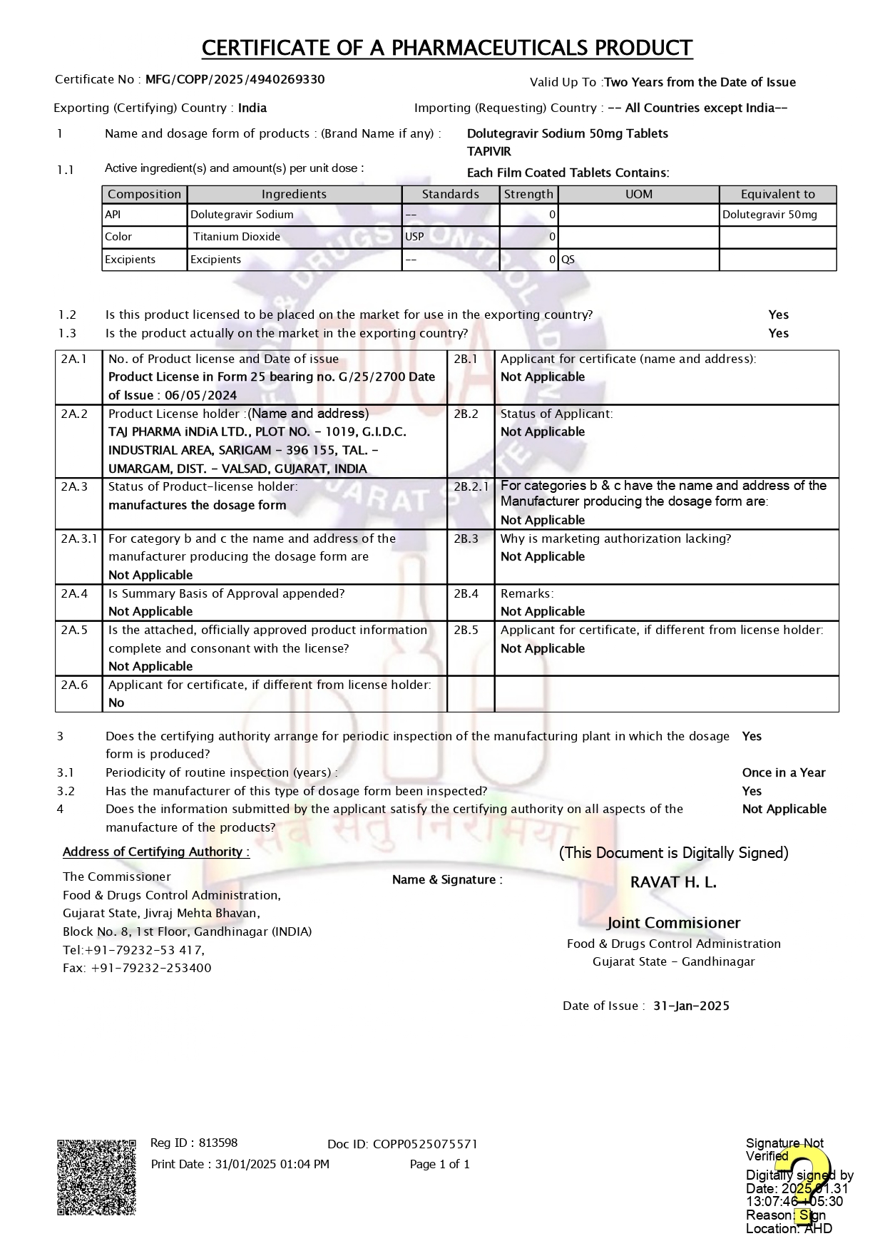 View COPP CertificateTAPIVIR 50 is a premium quality Dolutegravir tablet containing 50mg of the active pharmaceutical ingredient. Dolutegravir is an integrase strand transfer inhibitor (INSTI) that is widely recognized as a first-line antiretroviral therapy for HIV treatment. Our TAPIVIR 50 formulation is manufactured under strict WHO-GMP and EU-GMP standards, ensuring the highest quality, safety, and efficacy for patients.